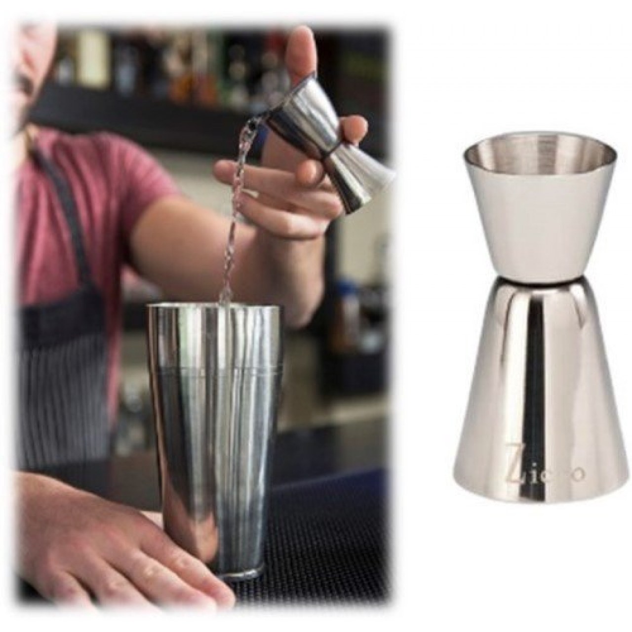 Barda ölçü kabı olarak kullanılan jigger tabanından birbirine yapıştırılmış iki metal bardak şeklindedir.