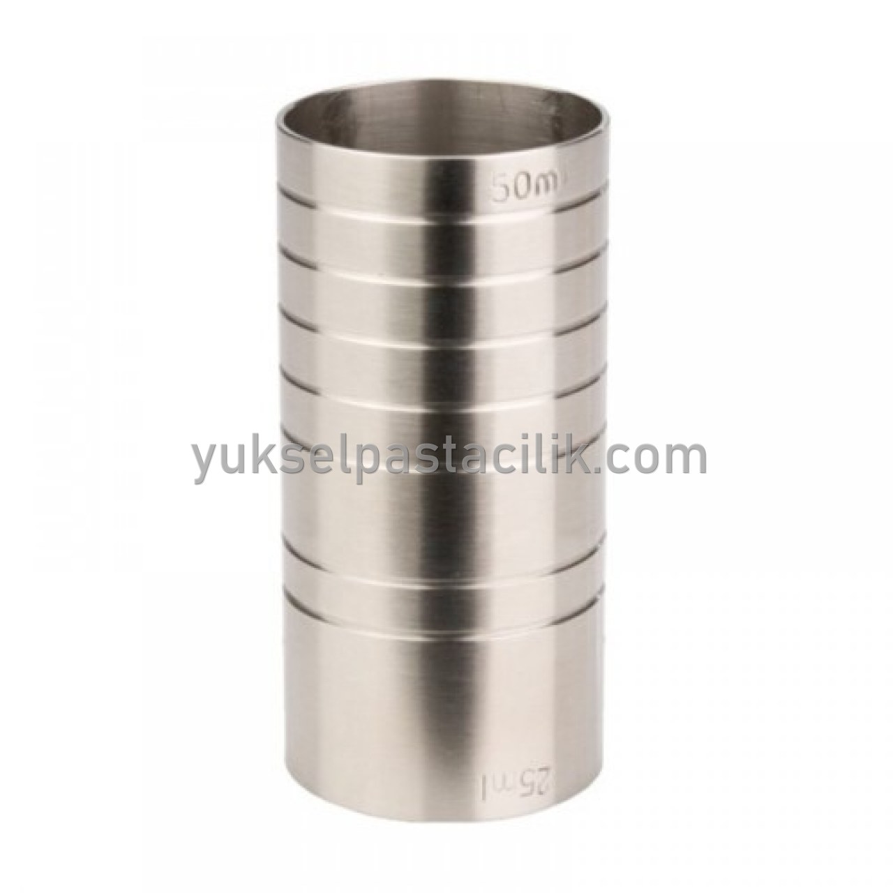 Barda ölçü kabı olarak kullanılan jigger tabanından birbirine yapıştırılmış iki metal bardak şeklindedir.