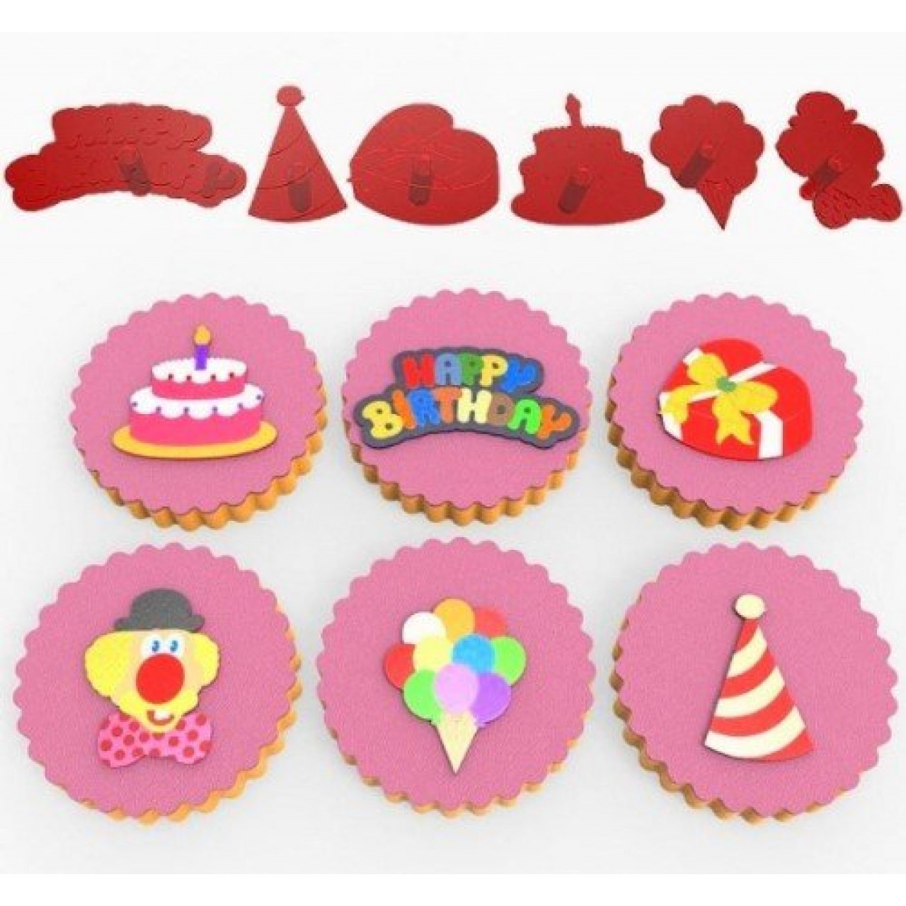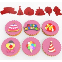Balon 3,5X2,8 Cm, Happy Birthday 2,5X5 Cm, Hediye Paketi 3X3,4 Cm, Palyaço3,7X2,6 Cm, Pasta 3,4X3,5 Cm,Şapka 3,3X2,1 Cm
