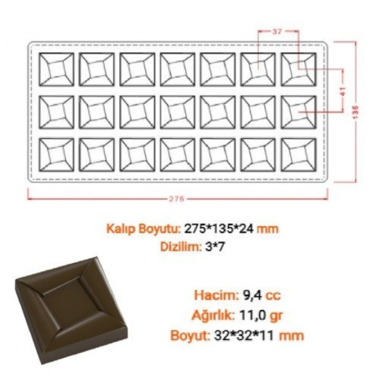 Polikarbon Çikolata Kalıbı Kare 21 li