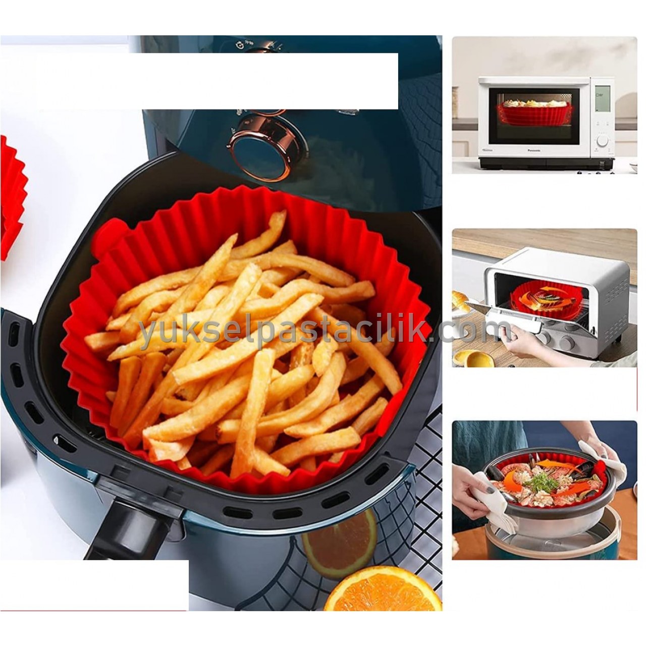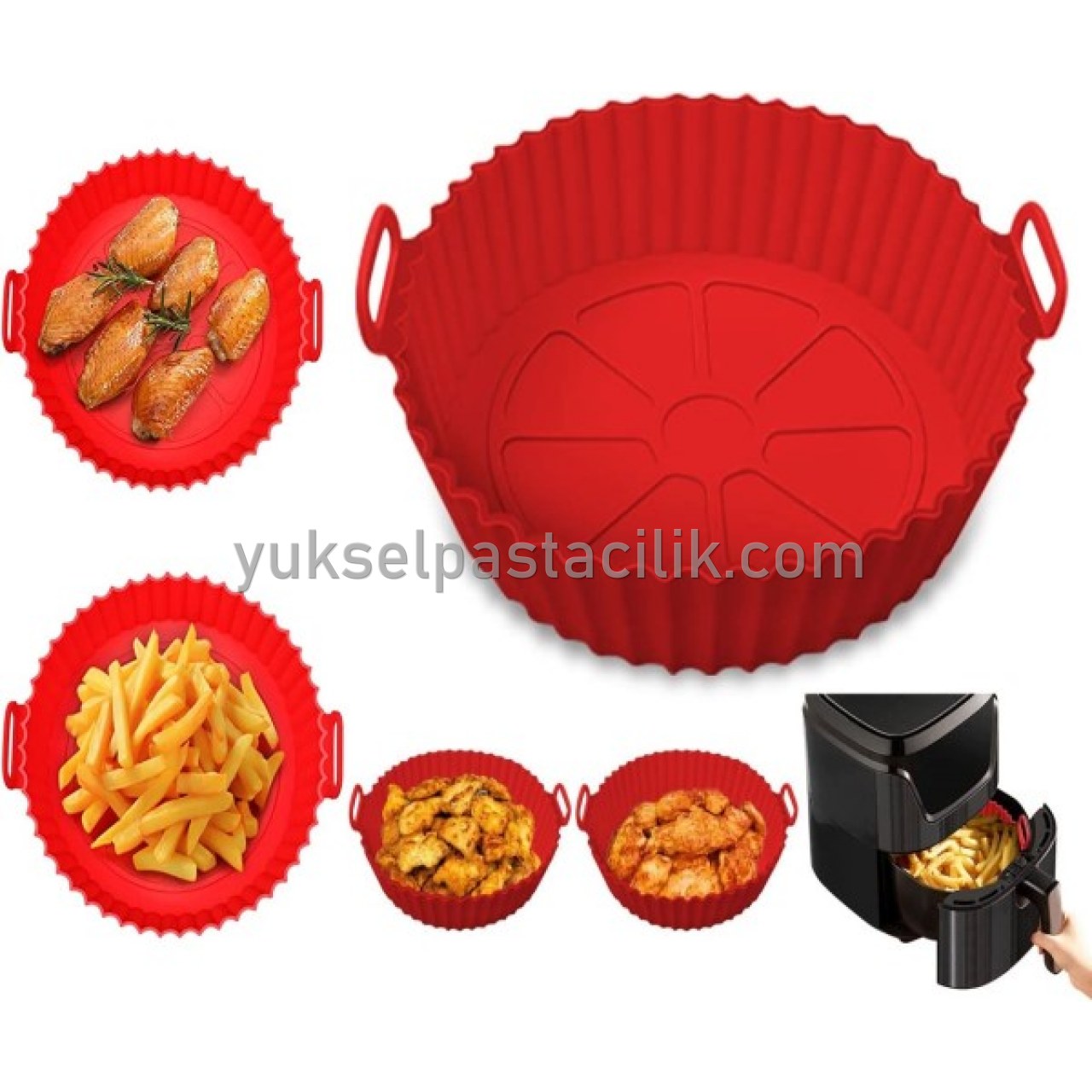 Airfryer Silikon Pişirme Kalıbı, hava fritözünüzde gıda kalıntısı, kir vb. bırakmaz. Hava fritözünüzün ömrünü uzatır.Tamamen bulaşık makinesinde yıkanabilir, elde yıkamak zorunda değilsiniz, temizliği oldukça basittir.Yüksek kalite malzeme; kızartma, buharlama ve fırın pişirme için premium gıda sınıfı silikon hammadde ile üretilmiştir.Her iki tarafında kalıbı rahatlıkla çekebilmeniz için tutma yerleri mevcuttur.Kalıbı hava fritözü dışında fırın, mikrodalga ve dondurucuda kullanabilirsiniz.